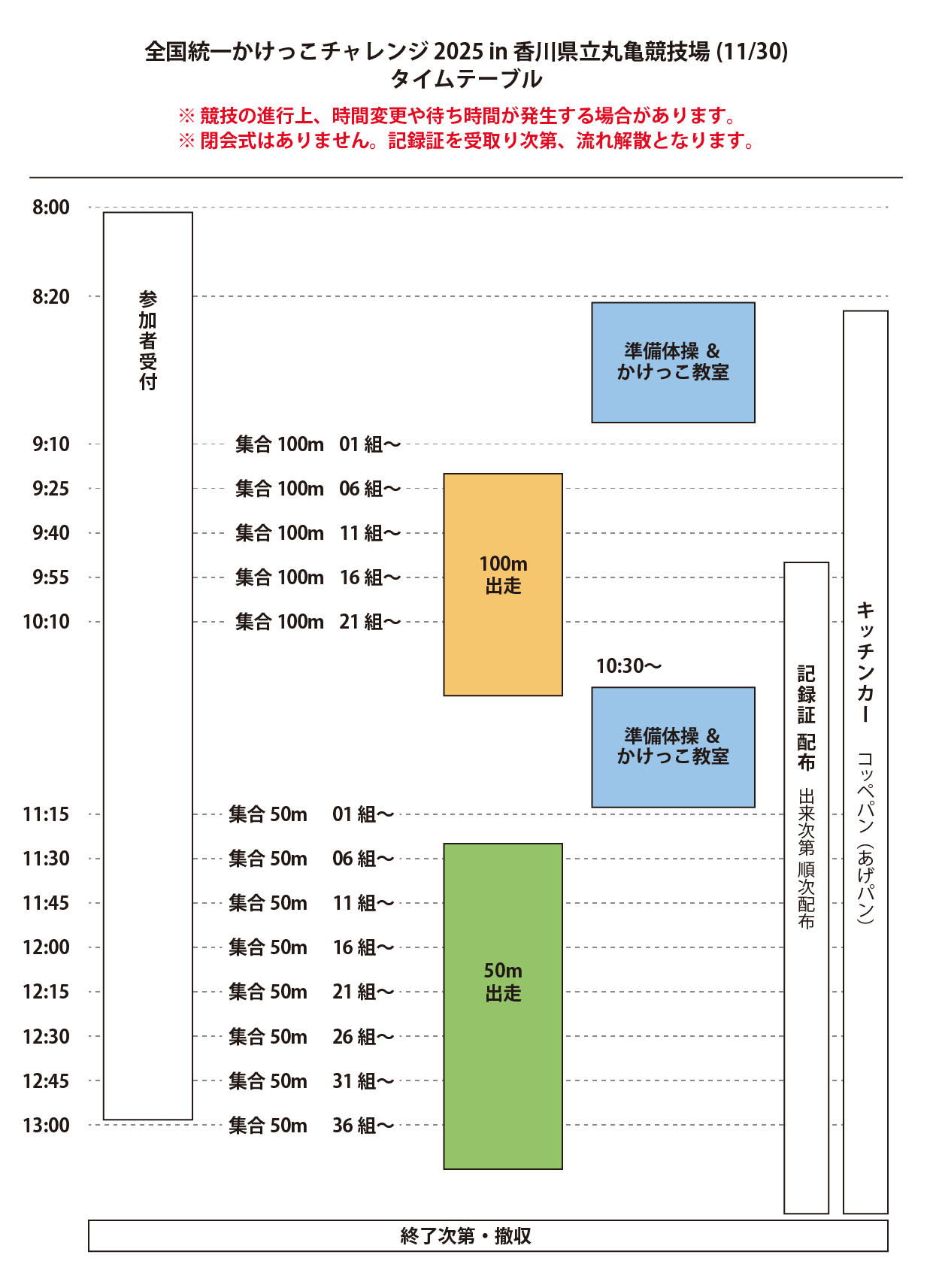 当日走る「組」「レーン」及び、「集合時間」は、以下の表よりご確認ください。